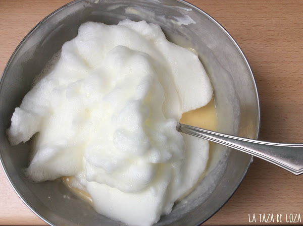 Se ponen las claras a punto de nieve, casi a punto de merengue dentro del recipiente en el que tenemos los huevos con el chocolate y el queso crema y se incorporan estas despacio removiendo con una lengua de pastelería, poco a poco para que no se nos baje mucho el merengue.