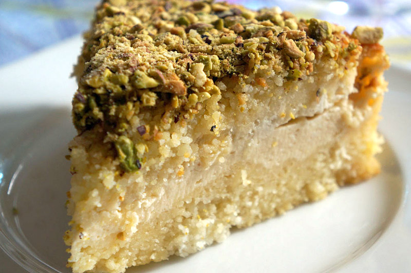 Cuando se saca la tarta del horno se vierte con cuidado el almíbar por toda la superficie, ya sólo queda cubrirla con pistacho picado y listo.