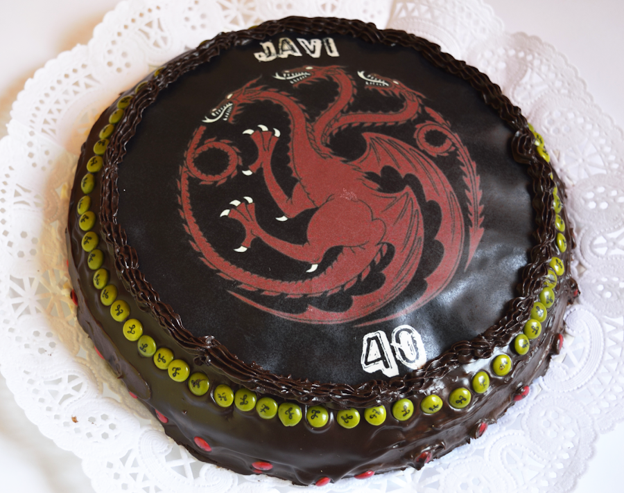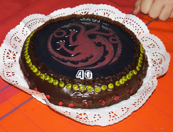 Hoy os traigo una tarta, que seguro que a más de un fan de la serie de Juego de Tronos le va a gustar, je je je.Mi cuñado Javi, este año ha cumplido ¡ 40 añitos! Y para celebrarlos este año decidí prepararle una tarta especial, le encanta el chocolate y es muy fan de Juego de Tronos, sobre todo de la Casa Targaryen, así que la tarta, evidentemente en su mayor parte fue de chocolate y para decorarla, recurrí al maravilloso papel de azúcar, ¡que chulas quedan las tartas con él!, una vez más le pedí a Eva y Manuel de Mi dulce Mordisco, que me imprimieran una foto con el escudo de la Casa Targaryen donde había añadido su nombre y los añitos que cumplía.