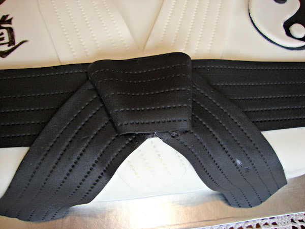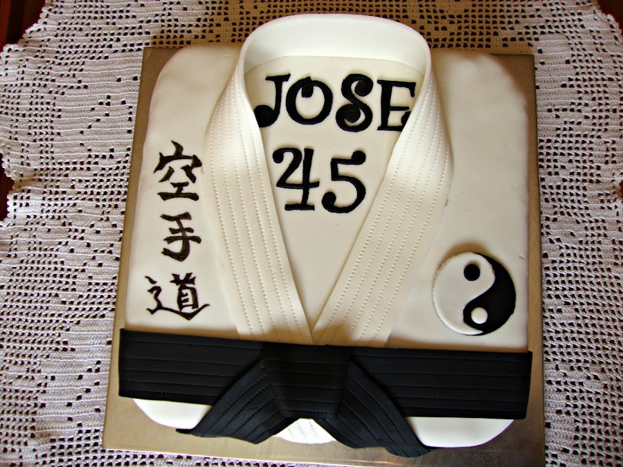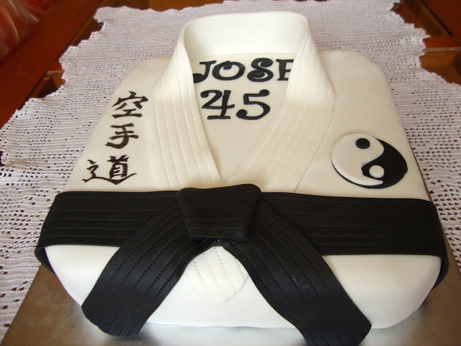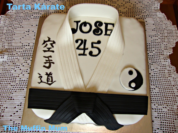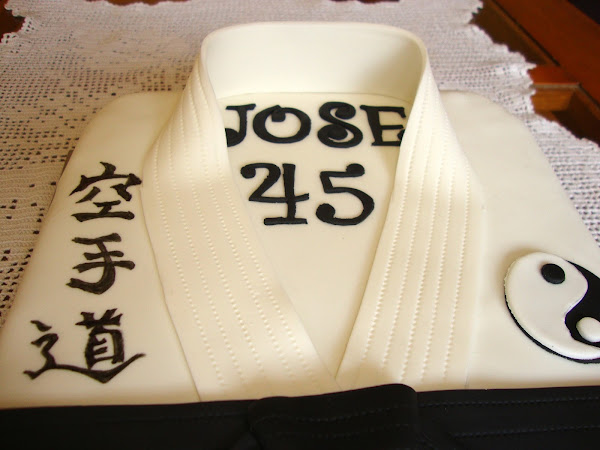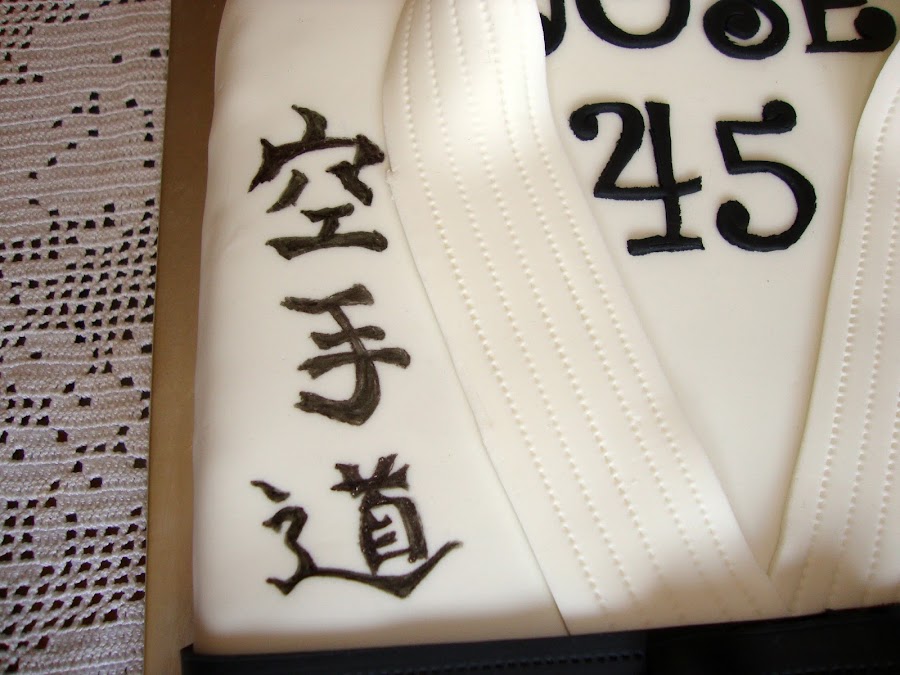 La decoración está realizada con fondant y rotulador comestible. En las letras pone Kara te do que significa la senda del karate.