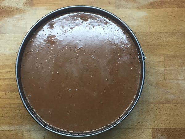 Después, echamos la mezcla encima de la base de galletas que preparamos anteriormente. A mi me gusta poner una cuchara del revés en la base para que la mezcla caiga y se reparta con suavidad.