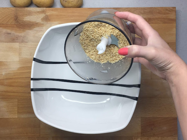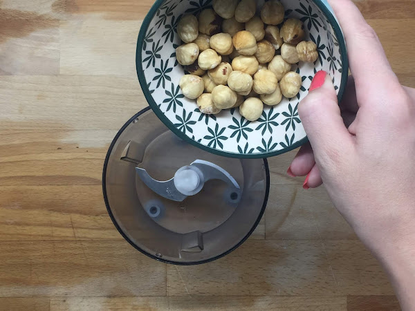 Primero ponemos las avellanas en la picadora de la batidora y las picamos hasta que tengamos un polvo de avellanas. Las echamos en un bol y las reservamos.