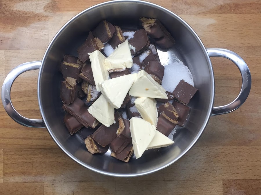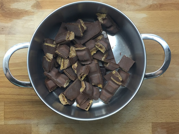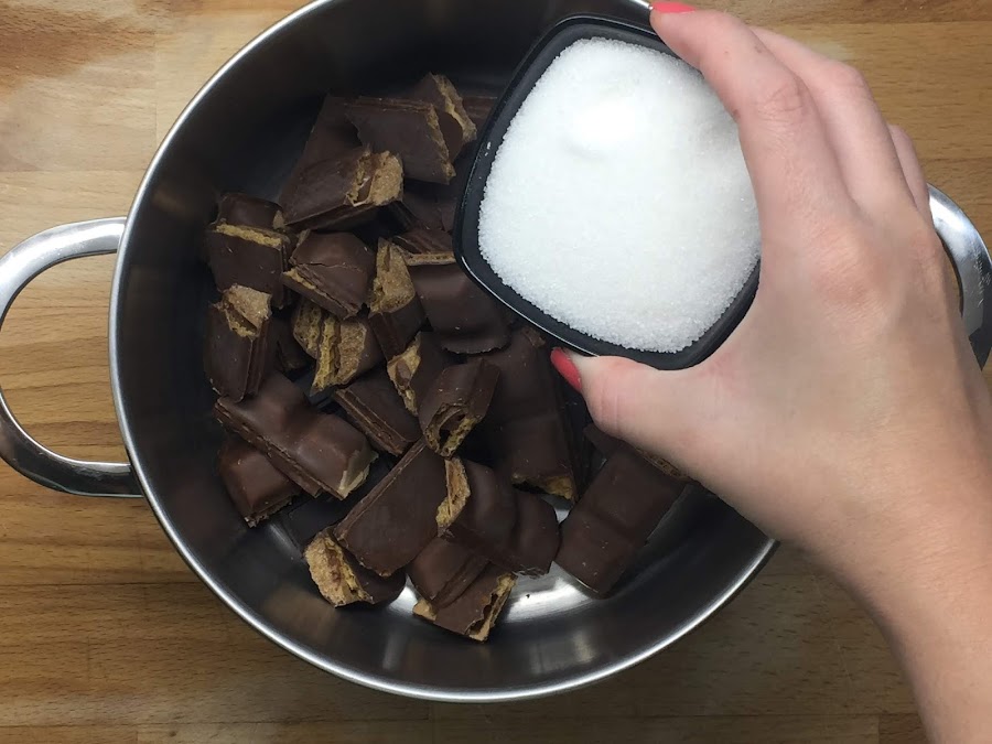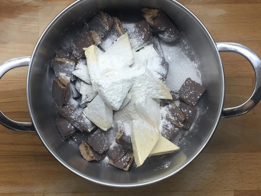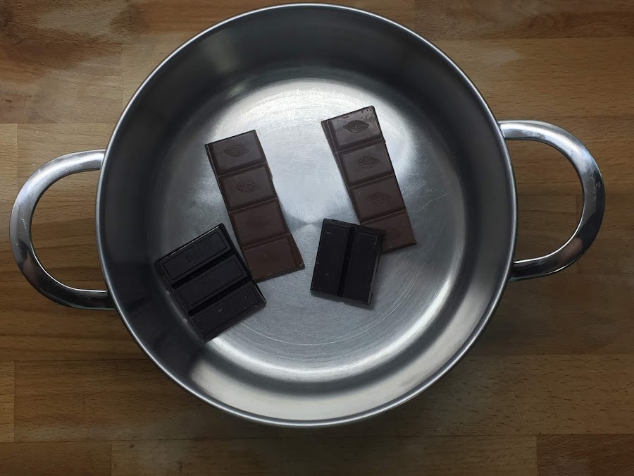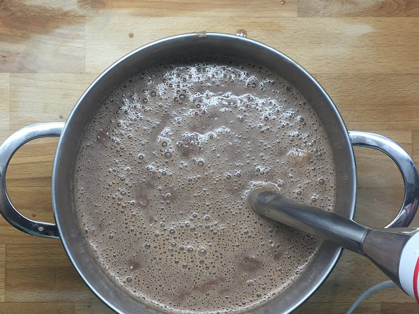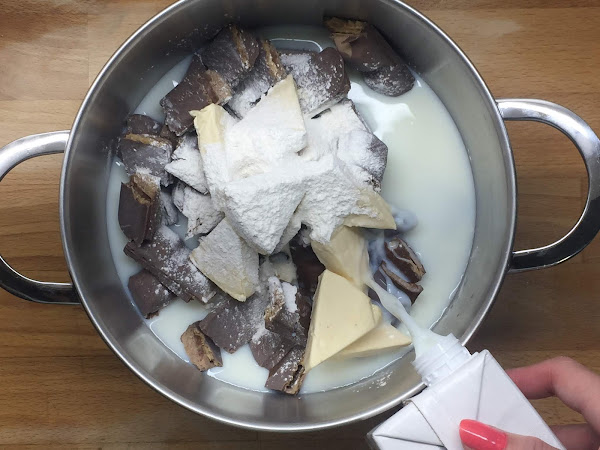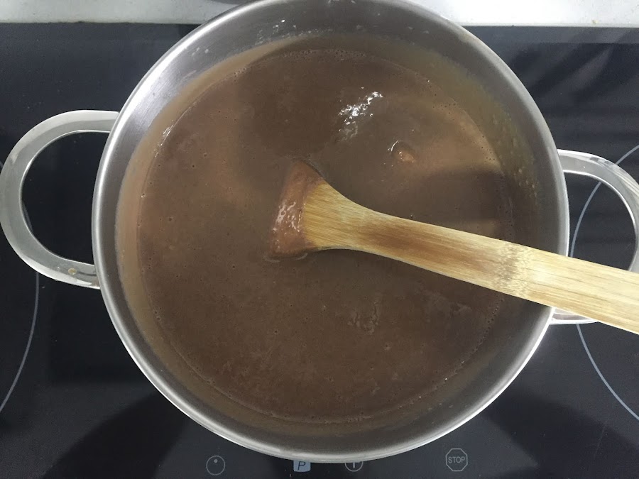 Ponemos todos los ingredientes en una olla y la ponemos a calentar a fuego lento hasta que se derrita todo el chocolate. Hay que tener en cuenta que no debemos dejar de remover para que no se nos pegue en el fondo y se nos queme.