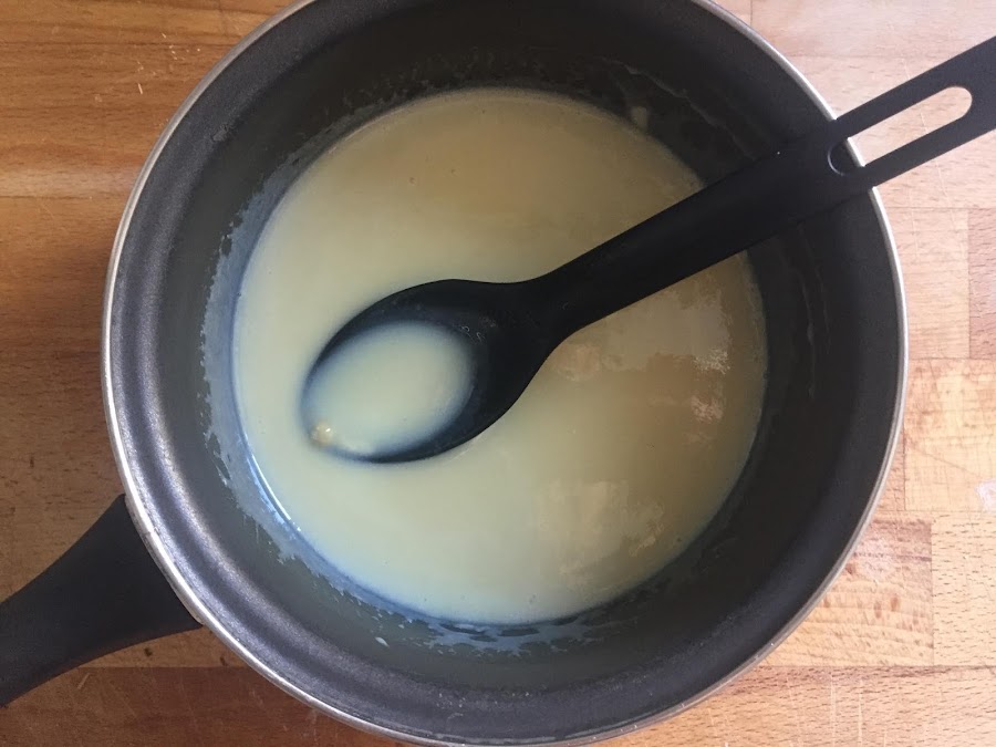 Cuando esté derretido, apartamos del fuego, y añadimos la gelatina hidratada y escurrida.