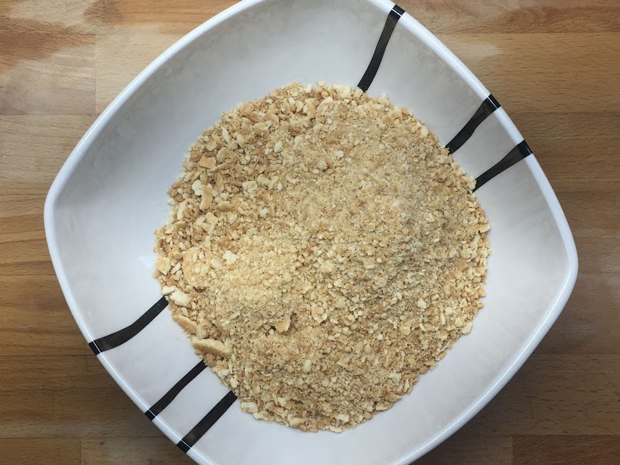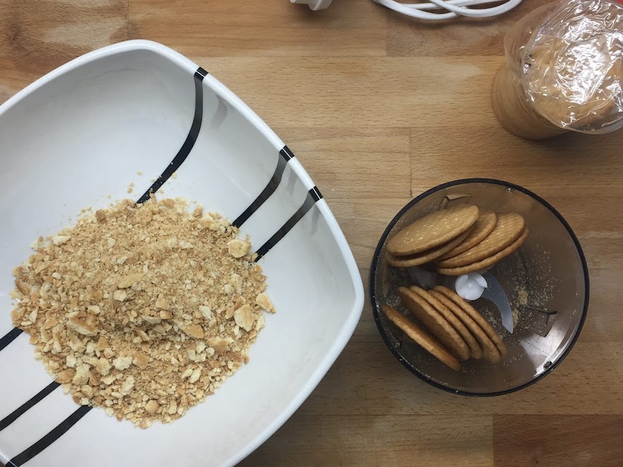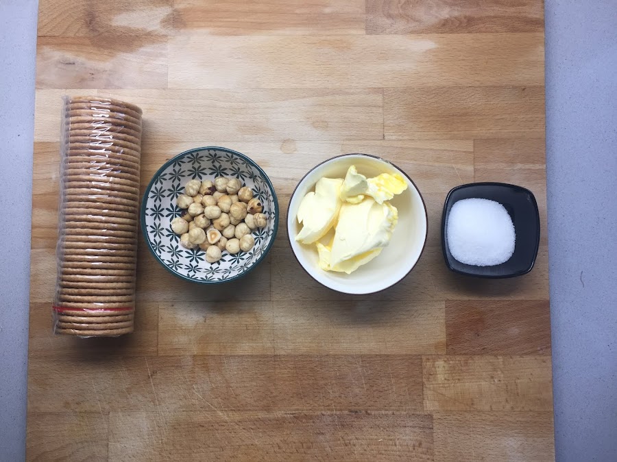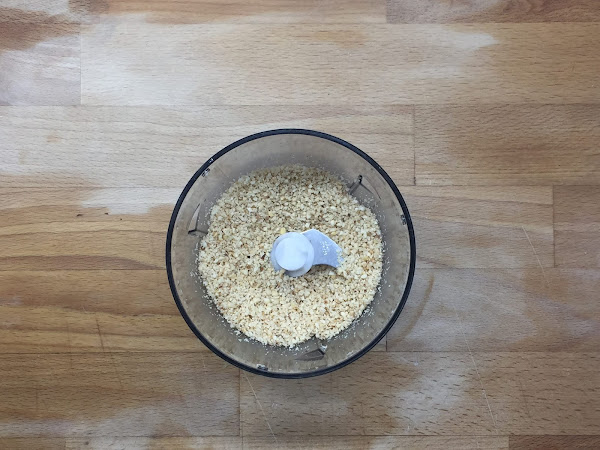 Ahora picamos las galletas en la picadora de la batidora con cuidado de no picarlas mucho, y las añadimos al bol con las avellanas.