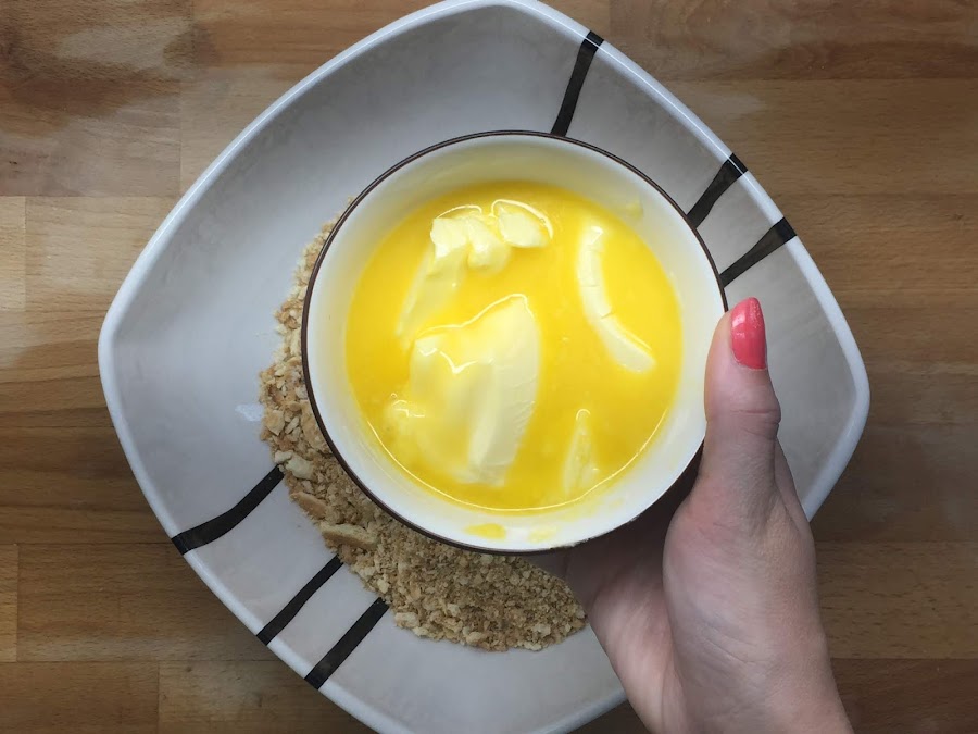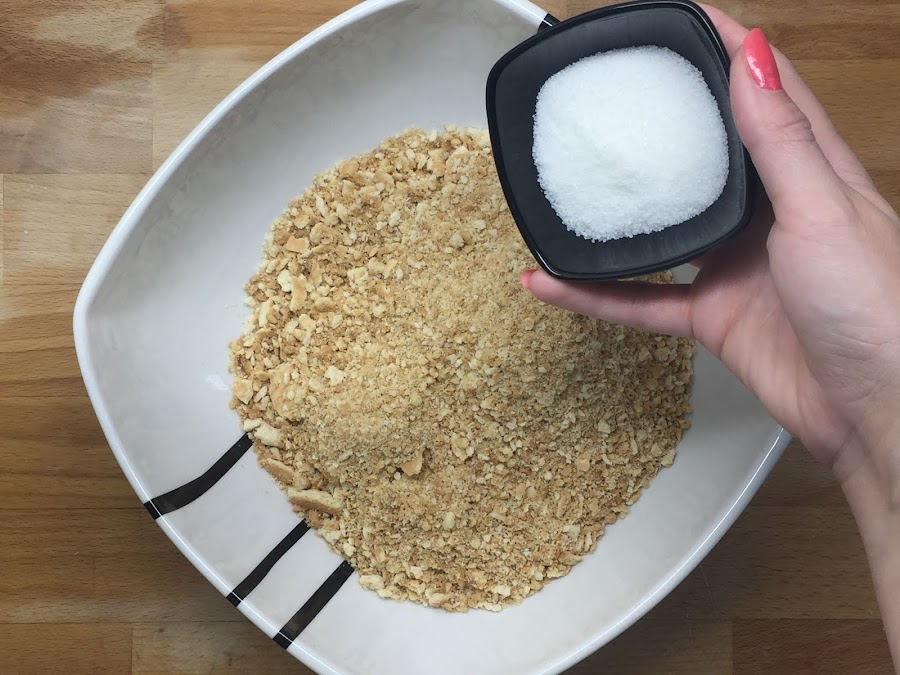 Después, añadimos el azúcar, derretimos la mantequilla y la añadimos; y lo mezclamos todo bien hasta crear una mezcla algo pegajosa.