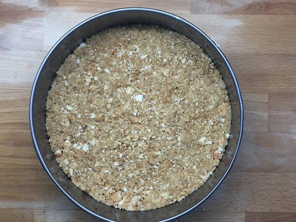 Por último, preparamos un molde desmoldable de 23 cm con un papel vegetal o lo untamos de mantequilla, y añadimos la mezcla anterior. La estiramos bien para que cubra toda la base y lo refrigeramos durante 30 min.