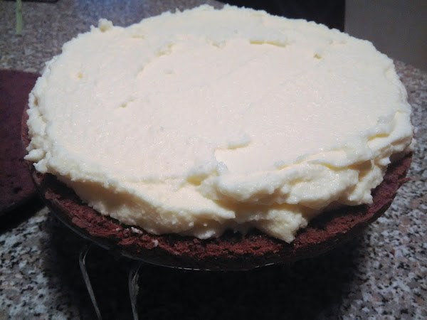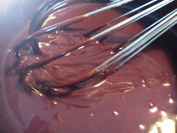 Primero hay que poner al fuego una tartera con la nata (crema de leche), una vez empiece a hervir se aparta, y se añadie la hoja de gelatina previamente hidratada en agua, junto con las onzas de chocolate. Se remueve sin parar hasta que el chocolate se haya derretido por completo y en ese momento se vierte por encima de la tapa superior de la tarta.