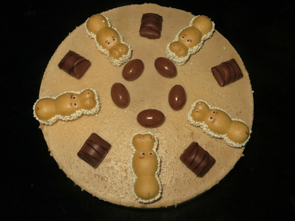Pasada otra hora, hacemos nuestra tercera y última capa, echamos 125 mililitros de nata (crema de leche), otros 125 mililitros de leche, el chocolate blanco y el kínder bueno. Como este último no se os deshará, una vez que tengáis el chocolate blanco disuelto, lo pasáis por la batidora, luego le añadís las hojas de gelatina hidratadas y le dais varias vueltas para integrar todo. Sacamos el molde del frigorífico y echáis la tercera capa. Lo dejáis dentro de la nevera hasta el día siguiente, la decoráis y ya está lista para servir.