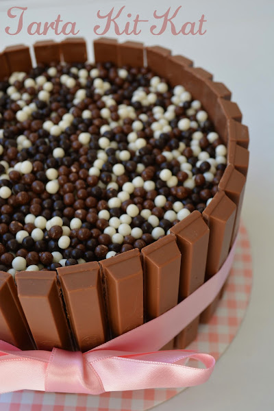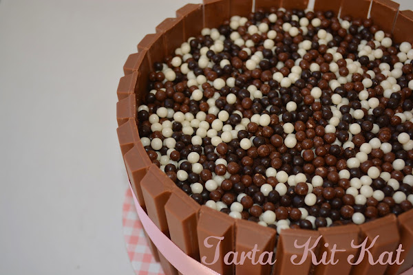 Ahora vamos a montar nuestra tarta: haremos dos cortes con ayuda de la lira, de modo que queden tres pisos de bizcocho. Bizcocho, nata montada (crema de leche), bizcocho, nata (crema de leche) y bizcocho de nuevo. Por encima, pondremos chocolate de cobertura que habremos derretido al baño maría y que usaremos a modo de pegamento, tanto para las bolitas, como para los kit-kat. Cuando tengamos toda la tarta "envuelta" de chocolate, empezaremos poniendo las barritas alrededor. Lo último que pondremos serán las bolitas que van por encima.