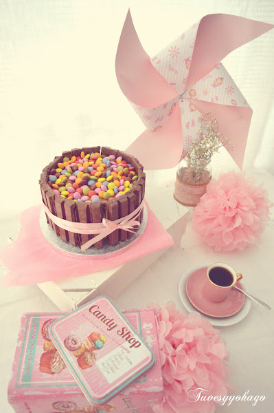 Quedó así de bonita o, por lo menos, a nosotras no lo pareció, aunque estuve a punto de no poder terminarla. Cuando estaba colocando los KitKat me encontré con que no tenía suficientes para todo el contorno de la tarta, así que envié a mi marido y a mis hijas a por un paquete más- Era cerca de las 2 de la tarde y no me acordé que en la calle había 40 grados o más. Cuando volvieron, los KitKat se habían derretido y casi perdido su forma ... . Rápidamente los metí en el congelador y algunos se recuperaron, pero la mayoría quedaron un poco deformados, aunque igual de buenísimos.... Creo que en alguna de las fotos puede verse algún KitKat un poco amorfo, jeje.