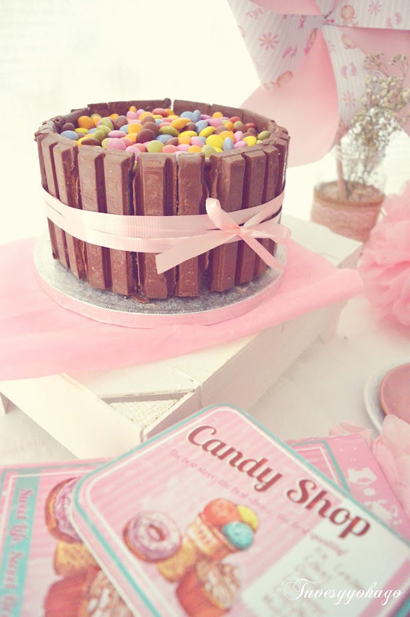 Por último coloca los últimos detalles: las grageas de colores y un lazo, que además de para decorar nos sirve para sostener los KitKat y para que la tarta te quede muy cuqui.