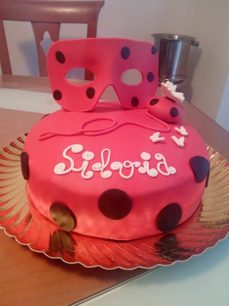 Buenas tardes!!! Aqui os dejo la ultima tarta que he hecho. Me la pidieron para el cumpleaños de Silvia que iva a cumplir tres añitos. La tarta era de bizcocho de yogur, rellena de buttercream de chocolate y cubierta con fondant con decoracion sobre los famosos dibujos de Ladybug. Como veis estan los articulos que identifican a este personaje como el antifaz y el yoyo que utiliza para cazar las mariposas negras y conbertirlas en blancas.