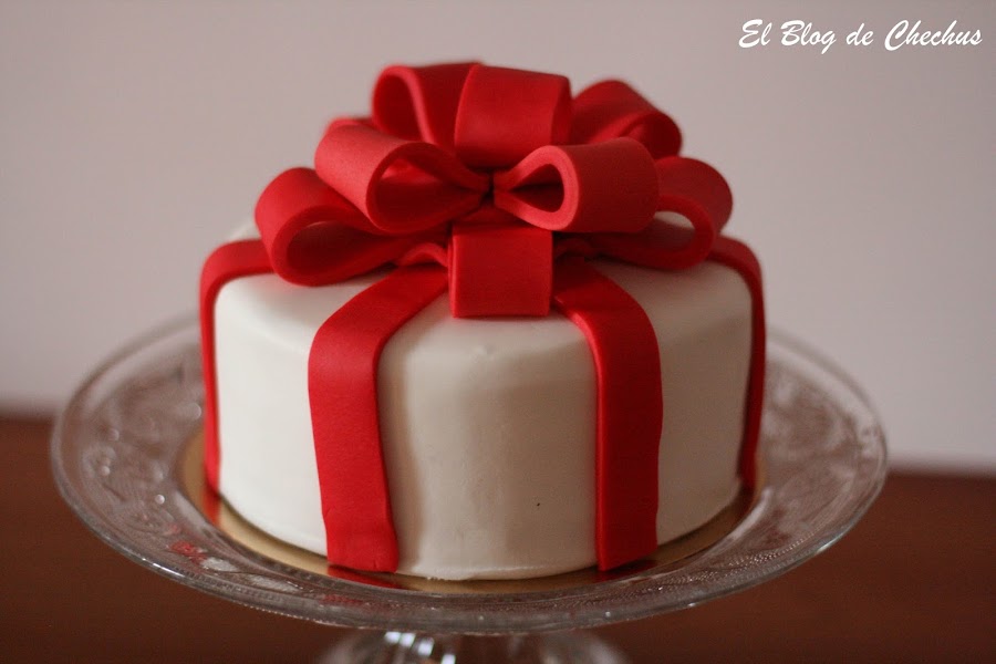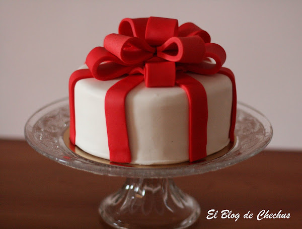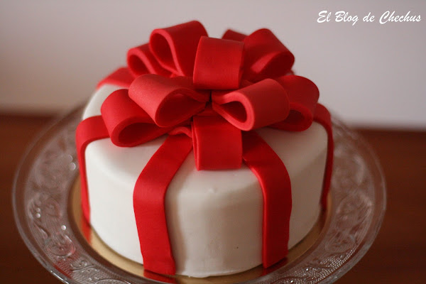 Y por fuera de fondant blanco y el lazo en rojo, que lo único que necesitas es hacer tiras y dejarlas secar dándole forma. Luego los vas pegando.