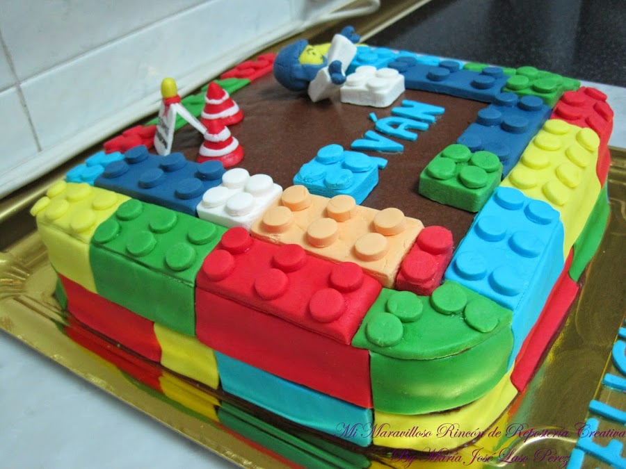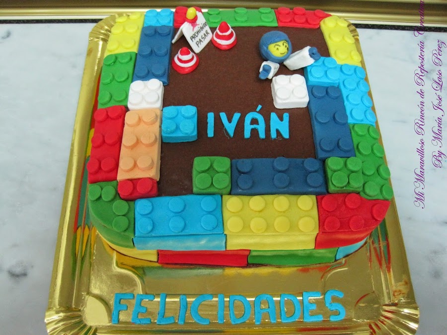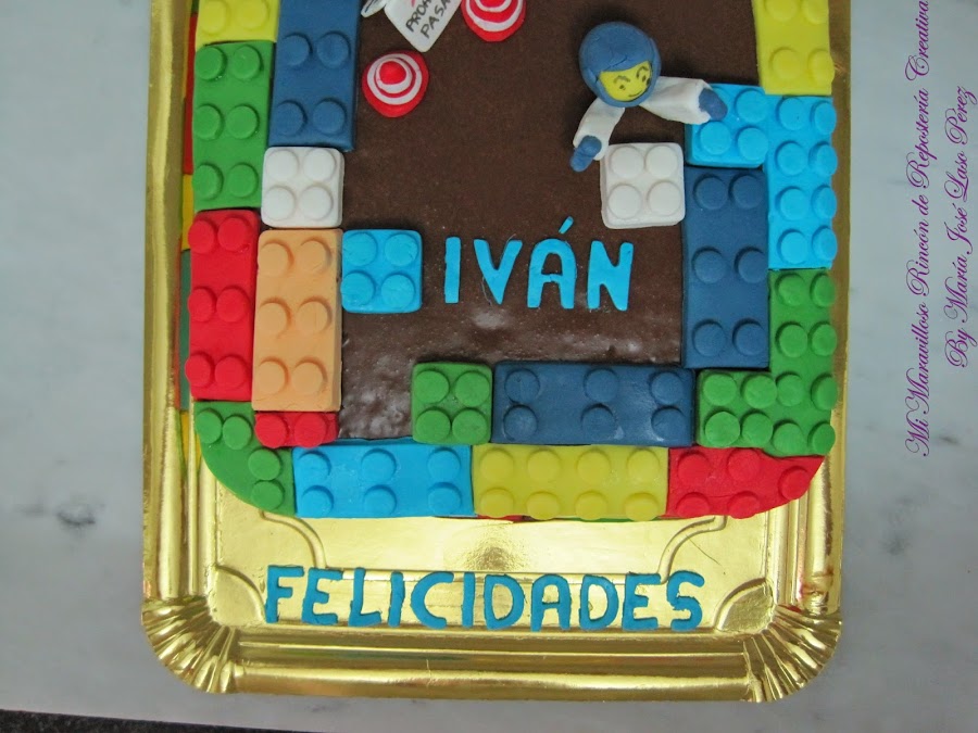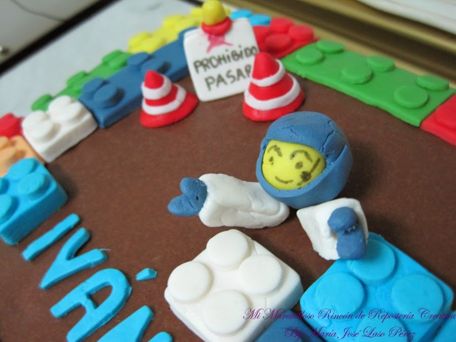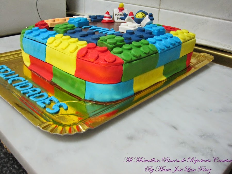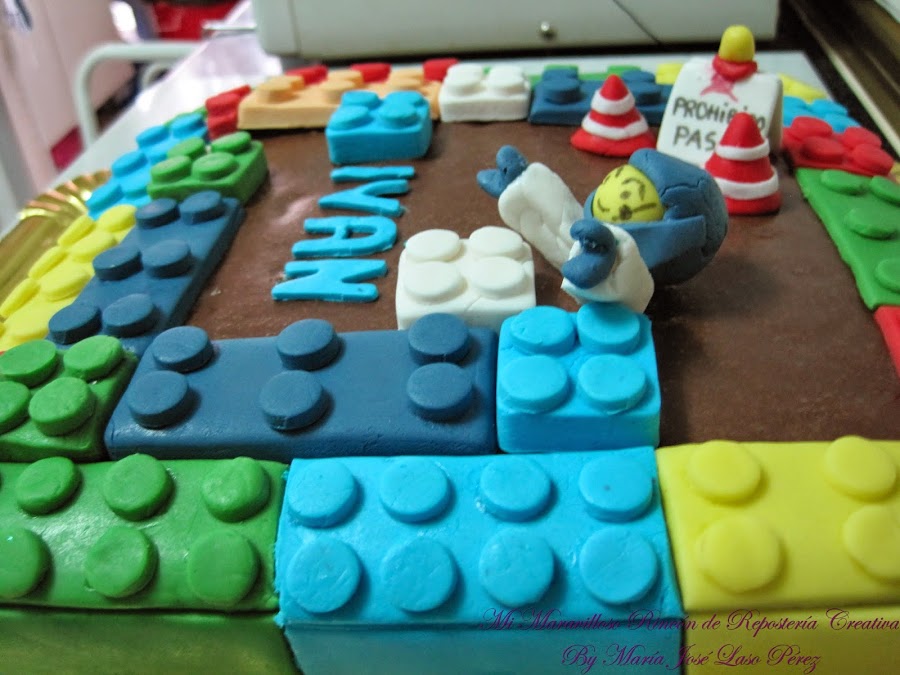 Fue una sorpresa el tema de la tarta para él, pues llevaba toda la semana preguntándome de qué se la iba a hacer. Su hermana y yo hemos jugado con él al despiste y le íbamos dando pistas falsas para que no supiera cual iba a ser finalmente el tema. Ha sido divertida y laboriosa pues como no tengo moldes de las piezas de Lego, he tenido que medir, cortar y comprobar que se ajustaba todo, un poco a ojo; en fin, ¡la madre también jugando a las construcciones!, ja,ja,ja, Y este ha sido el resultado...