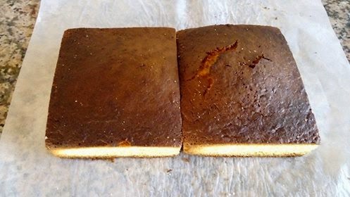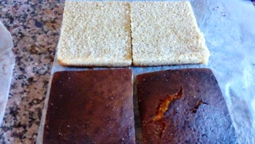 Lo que hice fue aprovechar la forma que ya tenían los bizcochos y simplemente corté los bordes de cada bizcocho para obtener rectángulos (pues originalmente los bizcochos eran cuadrados).