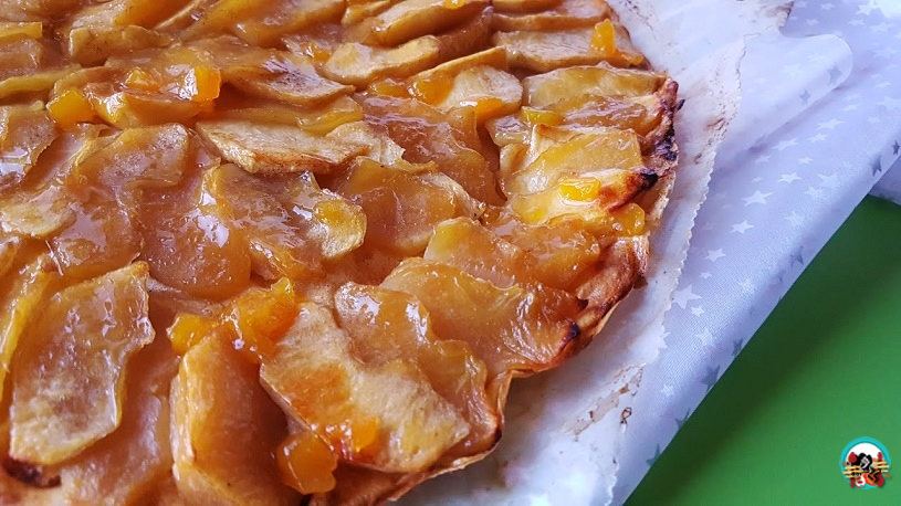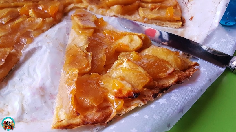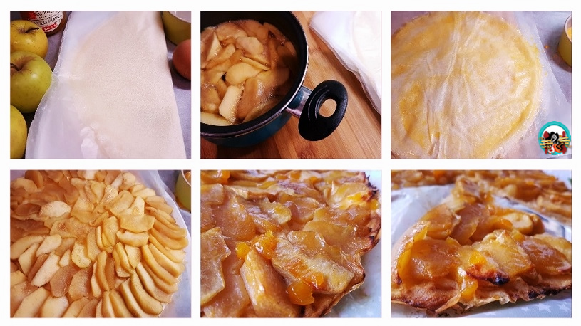 2. Estiramos las hojas de pasta filo, las pincelamos con un huevo batido. Disponemos las láminas una sobre otra, formando una capa de 6 láminas. Colocamos los gajos de manzanas cocinados sobre las laminas de pasta filo. Precalentamos el horno a 180º y horneamos la tarta 20 minutos. La retiramos del horno y la dejamos templar.