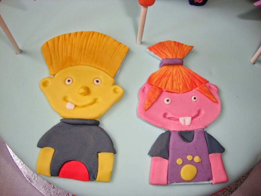 El bizcocho es un Velvet con doble relleno de buttercream de vainilla y cobertura de buttercream de vainilla. Toda la decoración es de fondant de varios colores y glasa elástica.