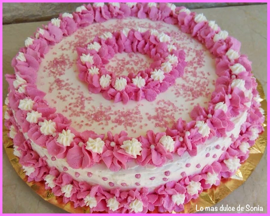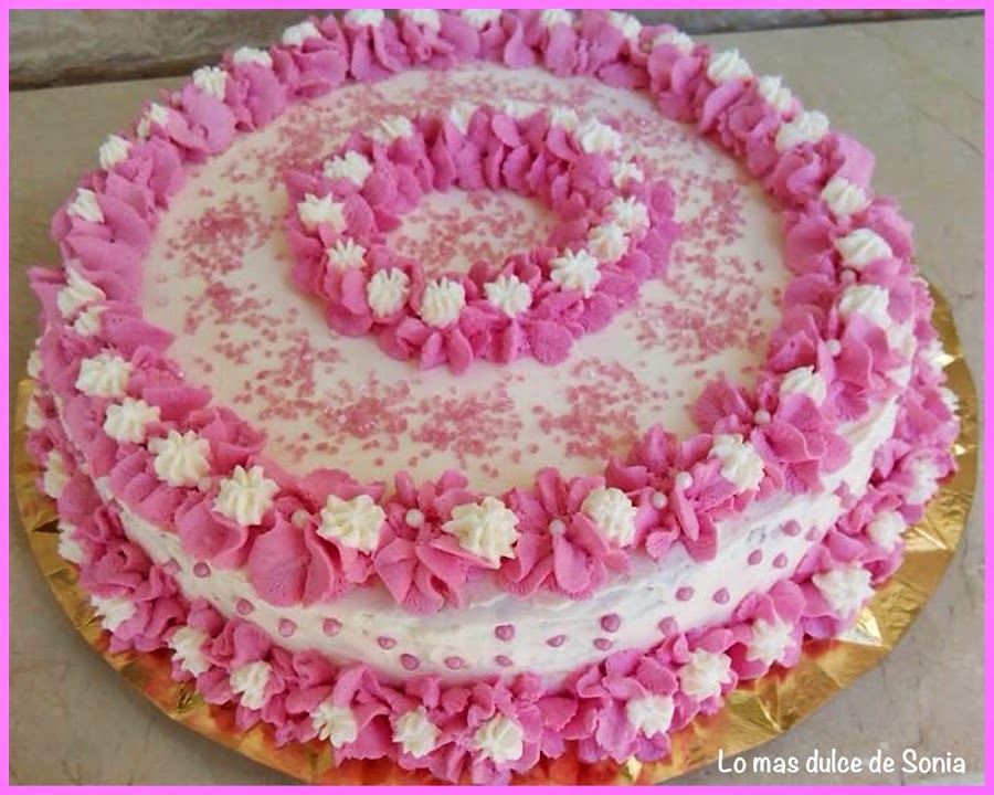Partimos el bizcocho por la mitad y rellenamos con el ganache de chocolate. Ponemos la otra mitad de bizcocho y cubrimos toda la tarta con la nata (crema de leche). Después decoramos con ayuda de una manga pastelera.