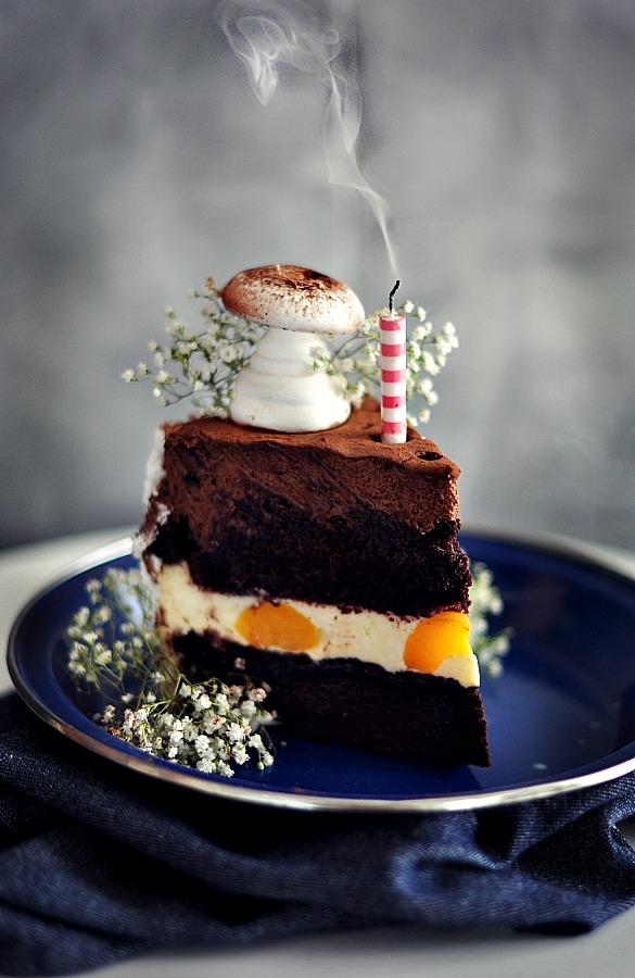 - Coloque el segundo bizcocho, mójelo con el almíbar de melocotón. Guárdelo en la nevera mientras realiza el mousse de chocolate.