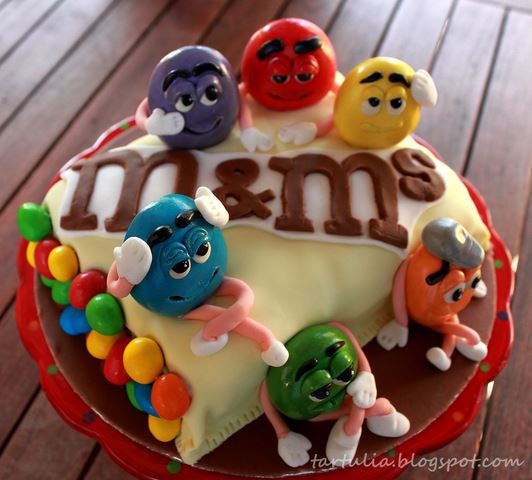 La elección de esta tarta vino determinada por los cumpleaños a celebrar en ella, chico y chica, Ivan y Ale cumplen años con muy pocos días de diferencia y lo pensaban celebrar con una barbacoa con sus respectivas parejas. Al ser un cumpleaños mixto no podía definir un tema concreto más femenino o masculino y opte por algo que gustase a todos, los M&M' s.