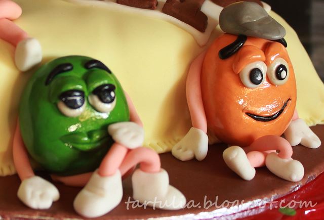 Modele los M&M´s en fondant unos días antes para que estuviesen secos y los pincele con brillo alimentario para que se pareciesen más a los originales, la inspiración de los modelos la encontré en la multitud de imágenes y dibujos de estos caramelos que hay en la red.