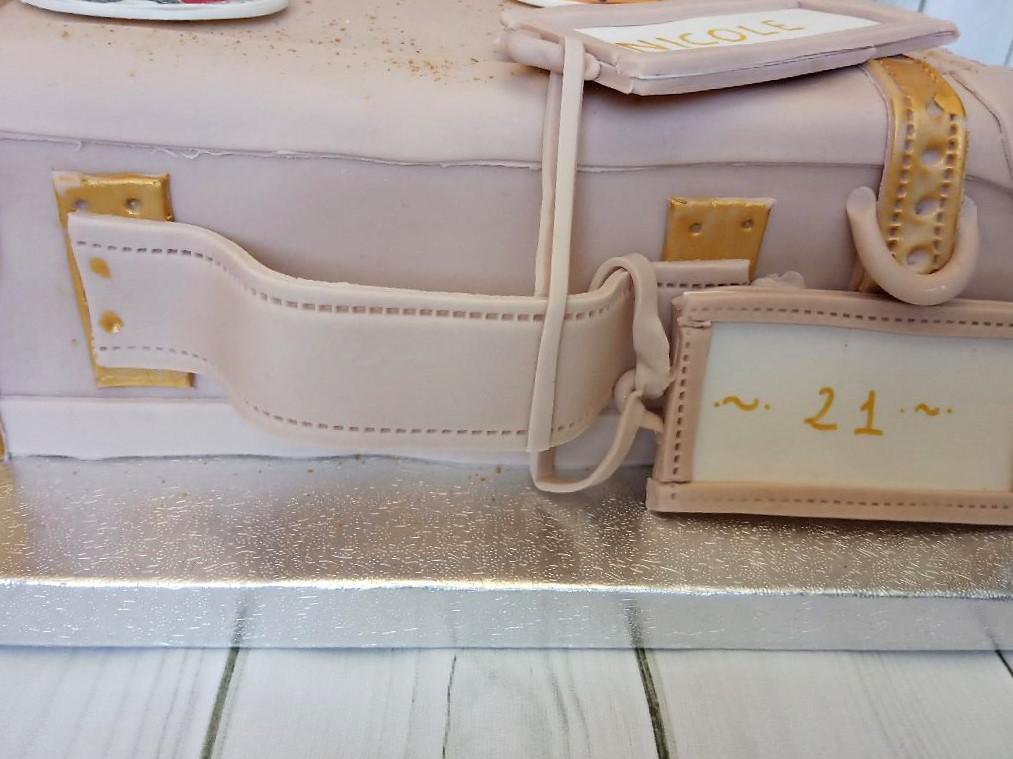 La decoración está realizada con fondant, pintura comestible y purpurina dorada comestible.