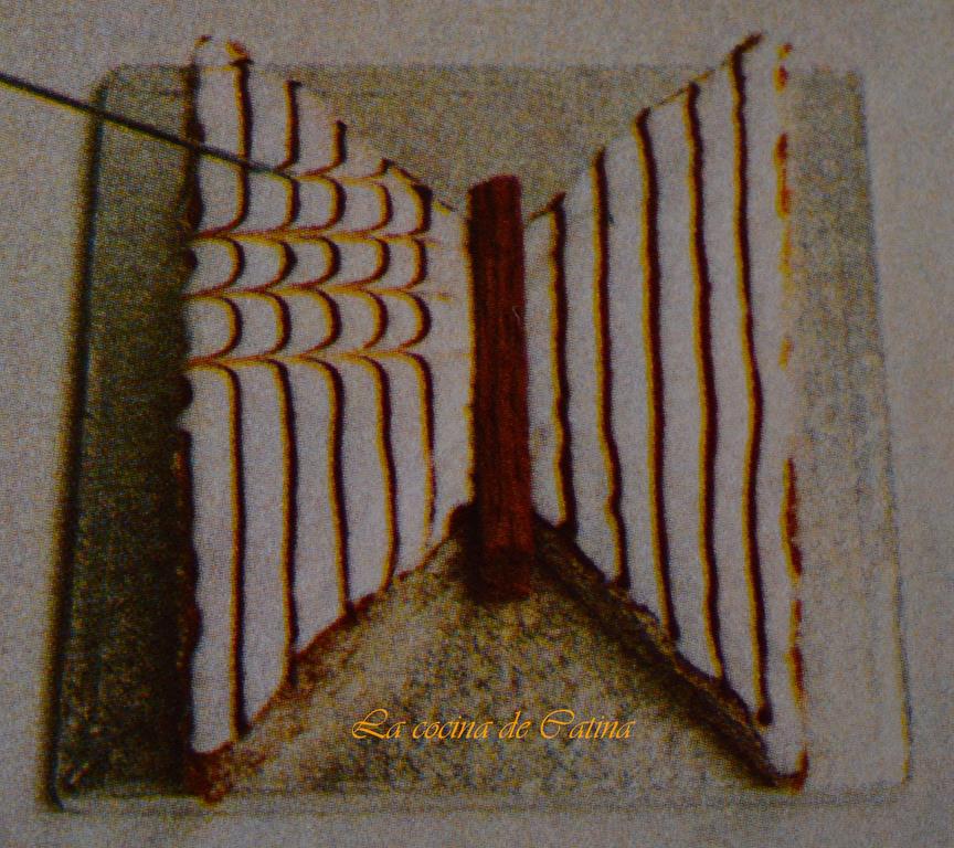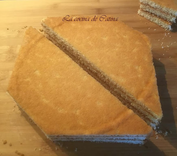Vertemos la masa en el molde y la horneamos durante 20 minutos. Sacamos del horno y cuando esté templado, lo desmoldamos y dejamos enfriar sobre una rejilla. Cuando esté frío lo partimos en dos o tres láminas. Podemos utilizar bizcochos precocinados de los que se encuentran en los supermercados. Lo partimos en diagonal y después cortamos las esquinas de los dos triángulos formados.
