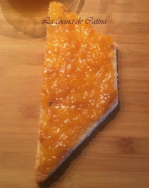 Reservar una cucharada de mermelada. Ponemos el resto de mermelada a calentar en un cazo a fuego lento y con ella untamos los laterales del bizcocho, pero no los cortes que hemos hecho.