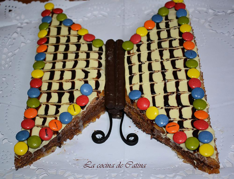 Tartas insuperables, rellenas de mermelada, cremas, merengue o chocolate, no hay postre que pueda competir con una buena tarta ¿o sí?. Surgieron de la imaginación, el acierto, la casualidad o el quehacer diario de los obradores de antaño. Esta tarta con forma de mariposa ha salido de uno de los muchos libros de Repostería que tengo y es la muestra de que con muy poco trabajo, podemos hacer una tarta muy vistosa y económica perfecta para un cumpleaños. A los niños les encanta.