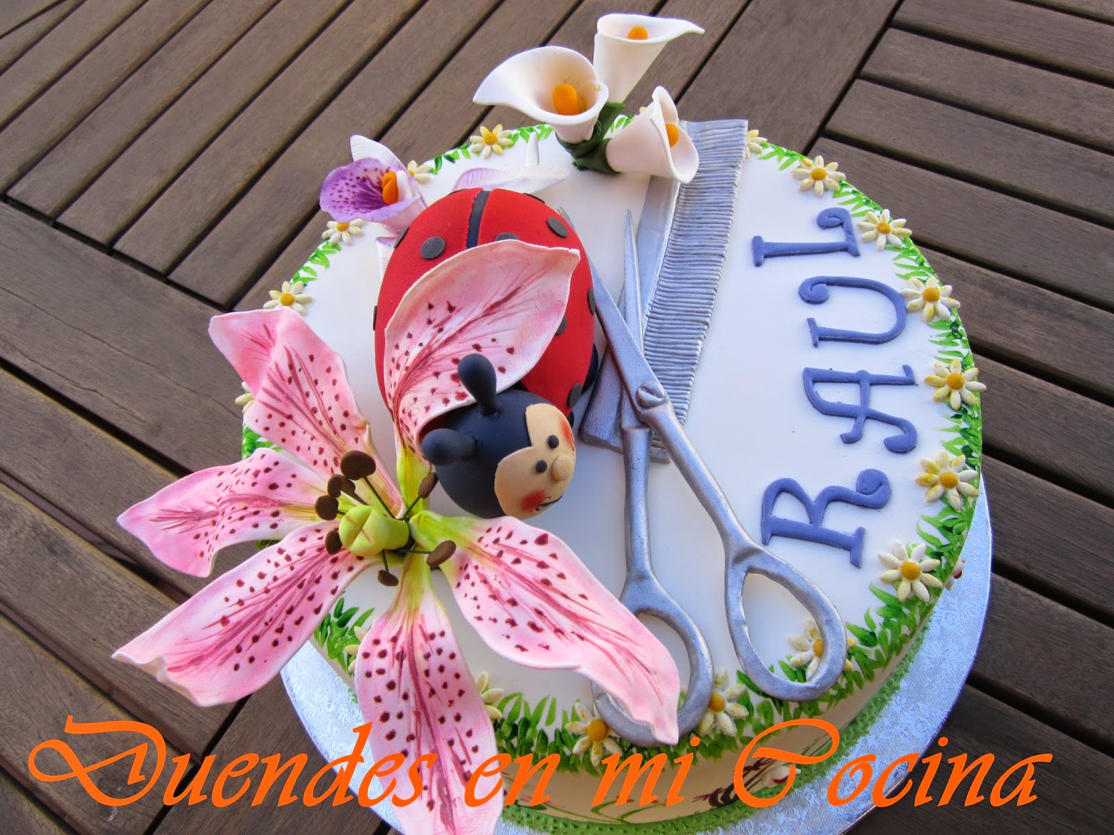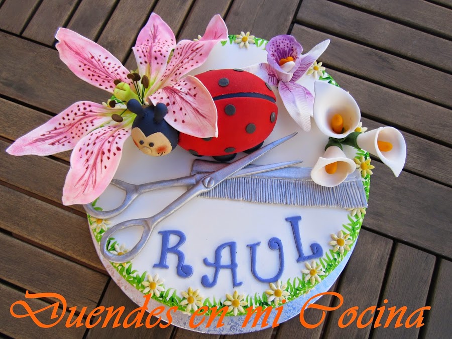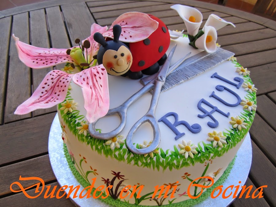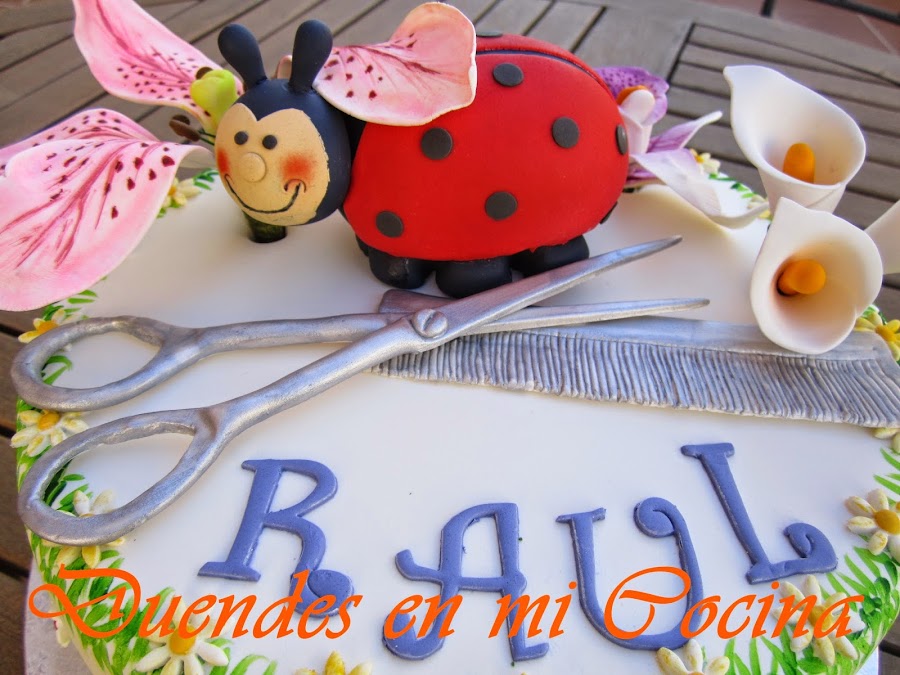 Esta tarta me la encargo un amigo que también es mi peluquero, de ahí las tijeras y el peine, claro. La diseñe con todo el cariño pensando en él y la verdad que es muy personal.
