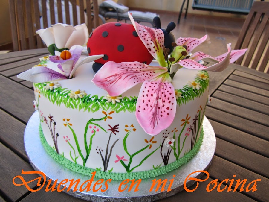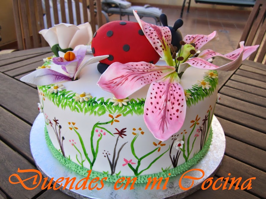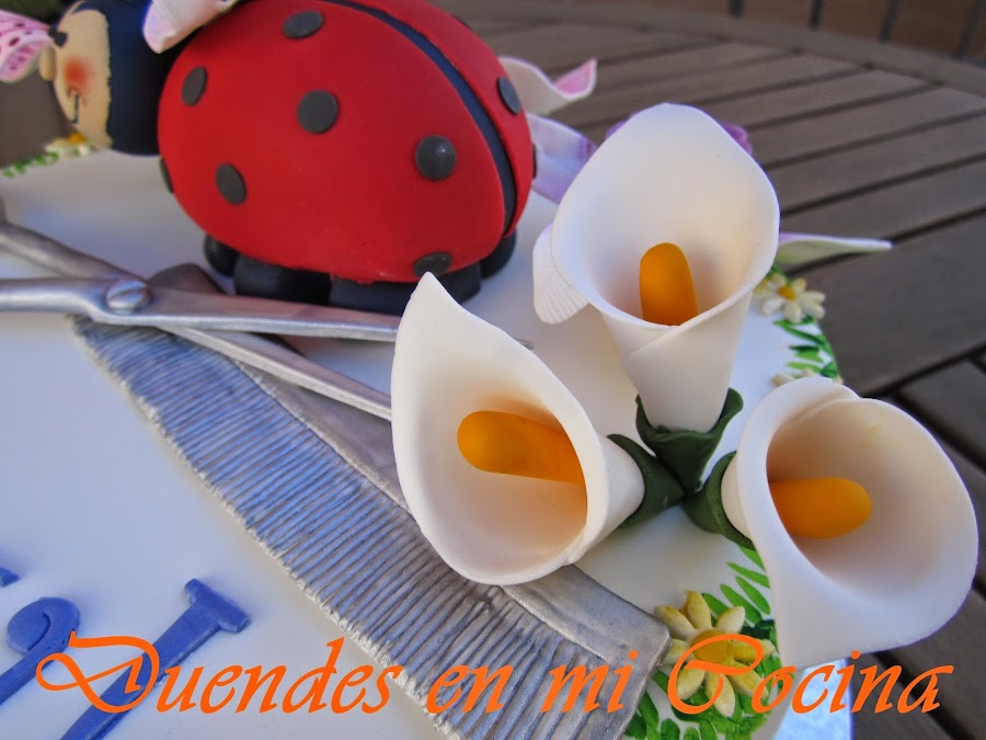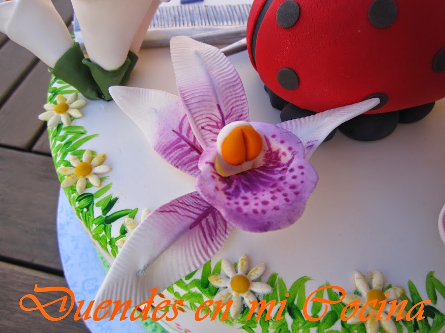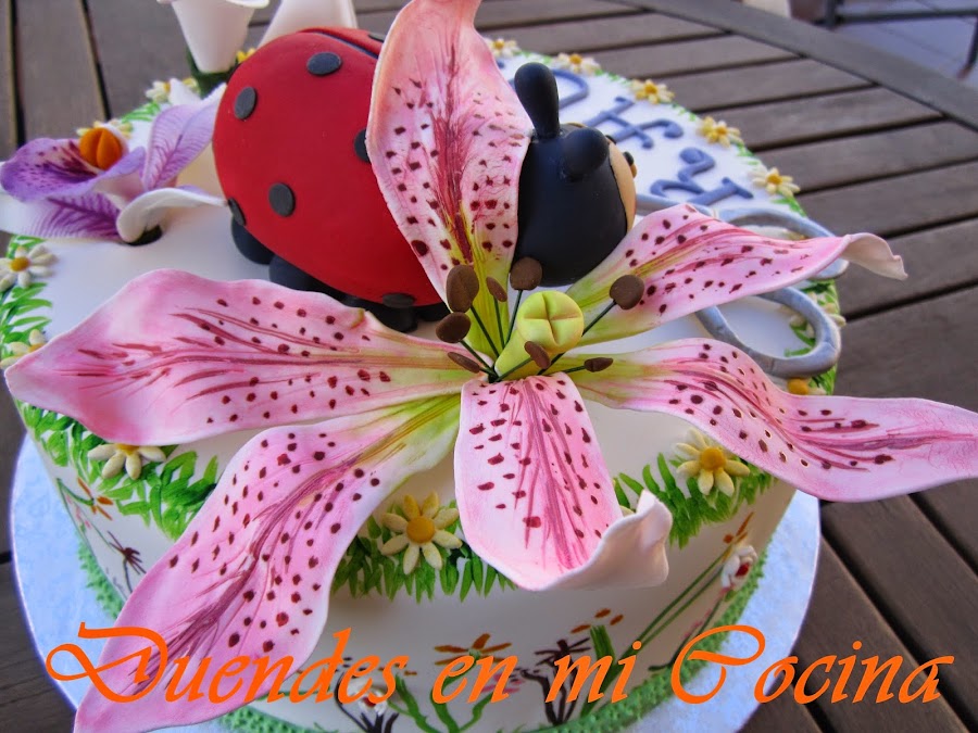 Los laterales de la tarta están pintados a mano, la decoración son lirios, orquídea y calas.