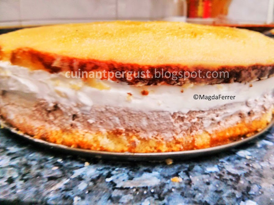 Etapa 1- Confeccionar el bizcocho base (receta aquí) en un molde desmontable. Dejar enfriar completamente. Partir por la mitad para obtener 2 discos. Limpiar el molde y colocar la base del bizcocho en él. Reservar la otra parte del bizcocho.