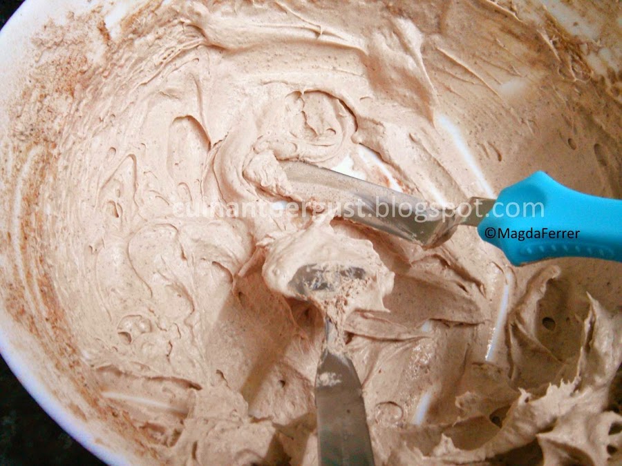 Etapa 3- Montar ½ litro de nata (crema de leche) vegetal. Colocar una gruesa capa de sobre la capa de trufa, ya endurecida, sin sacar el pastel del molde. Alisar, depositar el pastel en el congelador y esperar que la nata (crema de leche) se endurezca.