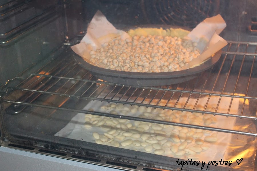Le colocamos unas legumbres secas, yo uso garbanzos y horneamos. Horneamos después sin los garbanzos. Mientras horneamos podemos tostar las almendras del relleno. ¿Las veis debajo de la masa?