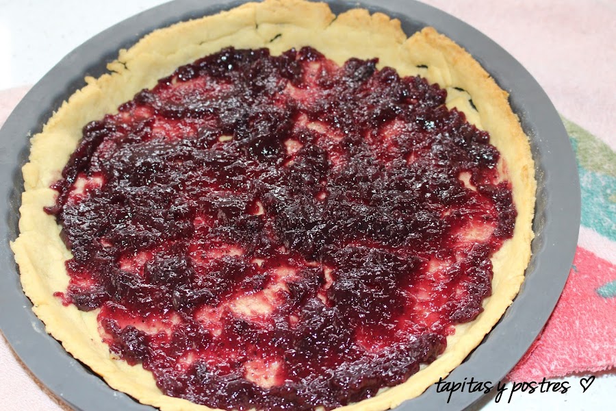 Posteriormente, rellenamos la tartaleta de masa con una capa de mermelada de arándanos.