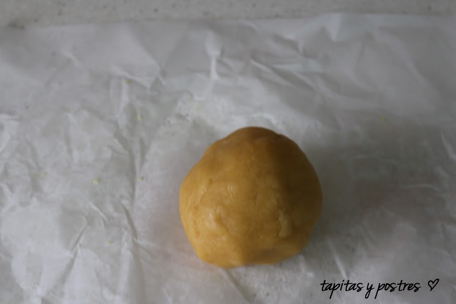 En primer lugar, ponemos en un bol la harina con la mantequilla a punto de pomada, la yema de huevo, la cucharadita de azúcar y la pizca de sal. Lo mezclamos todo bien con las manos hasta obtener una bola que no se pegue a las paredes del bol.