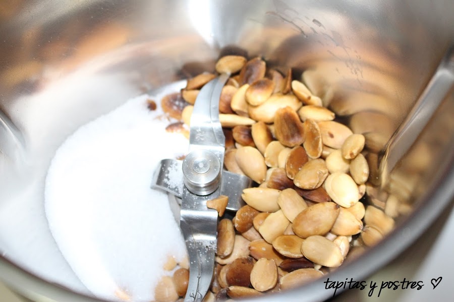 Vamos a preparar ahora el relleno. Con las almendras tostadas y el azucar hacemos una pasta.
