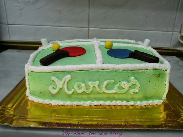 Hice las pelotas y las palas en fondant, sólo era un pequeño detalle, no resultaría empalagoso. El trabajo de cubrir de nata (crema de leche) y alisar la tarta fue hecho con espátula, las lineas de la mesa, con la manga pastelera dispuesta con una boquilla lisa ancha. Escribí el nombre y los años con la misma boquilla. Como estábamos invitados al cumpleaños, he de decir que pude probar la tarta y la verdad es que estaba riquísima. Super jugosa por dentro y muy suave en conjunto.