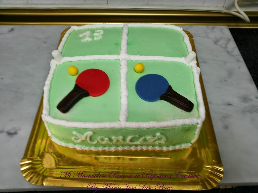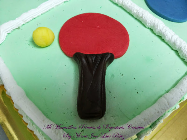 Esta nata (crema de leche) vegetal, se puede también colorear, para crear todo tipo de efectos. Yo no he visto demasiadas mesas de ping pong, pero la que vi en el centro juvenil donde van los chicos a jugar, era verde y eso me dio la idea para colorearla así. Me imagino que las habrá de otro color, pero yo le puse ese que era el que había visto en realidad.
