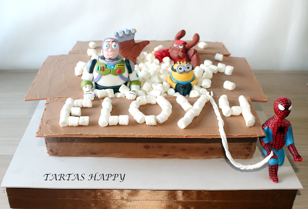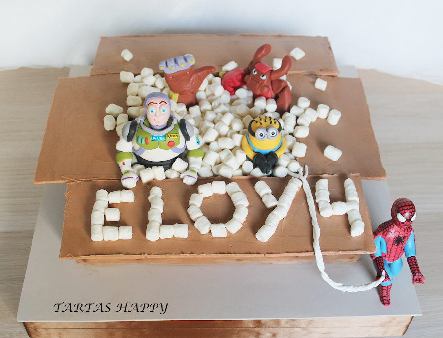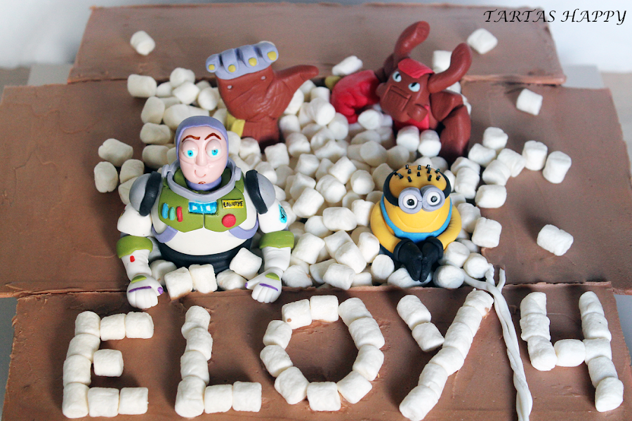 Este año Eloy quería que su tarta tuviera a todos sus muñecos favoritos,esos con los que siempre está jugando y que lleva con él a todas partes.