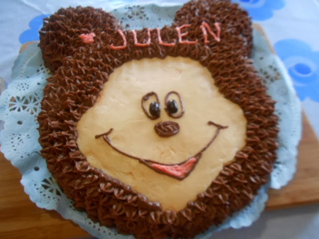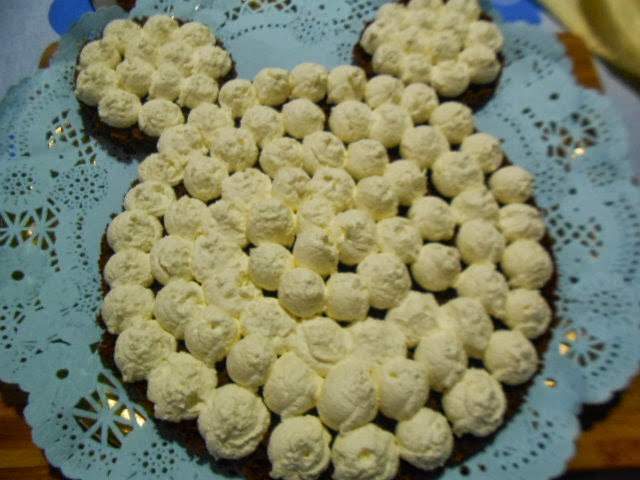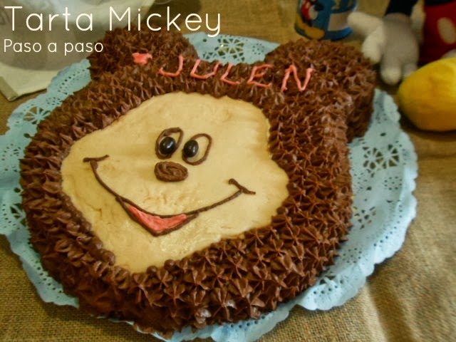 Hace unas semanas fue el cumpleaños de mi sobrino Julen al que le prepararé ésta tarta de Mickey,con bizcocho de chocolate con un relleno de nata (crema de leche) y trufa para decorar...