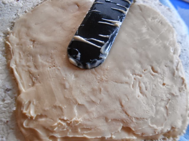 Ponemos la trufa en la manga pastelera y empezamos a cubrir la tarta siguiendo el dibujo