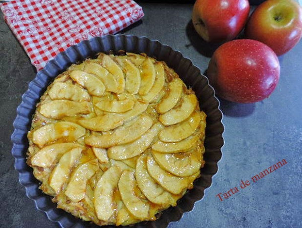 Pelamos y cortamos las manzana en laminas.Reservamos unas cuantas laminas para el acabado de la tarta.Mezclamos la manzana con la mezcla anterior.Vertemos en un molde desmoldable y forrado con papel de hornear.Terminamos la tarta con las laminas de manzana reservadas.