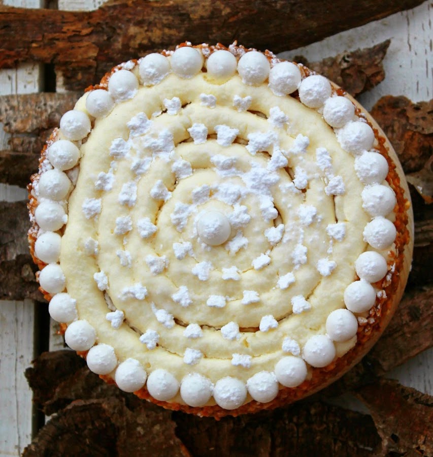 En una base de tarta vamos colocando primero una plancha de hojaldre, cubrimos de crema y volvemos a tapar con otra plancha. Repetimos lo mismo hasta acabar con todas las planchas de hojaldre y cubriendo el pastel con la crema restante. Yo he usado una boquilla lisa depositando la crema en forma de espirales para no ejercer presión con las manos. En los laterales espolvoreamos almendra crocante (otra de las cosas que le gustan a la jefa ;) ) y en la parte superior azúcar glas. Aguanta el ajetreo de dos niños pequeños a la perfección, probado personalmente ;) pero no es nada que una abuela no le perdonaría a sus nietos.