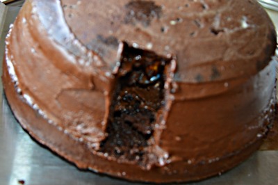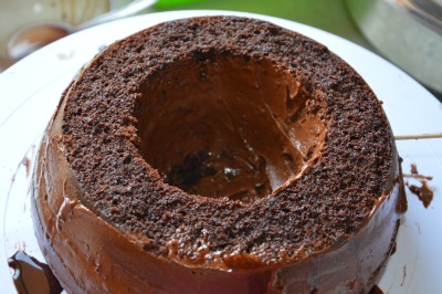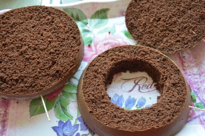 En el bizcocho del medio, cortamos un circulo justo en el medio.