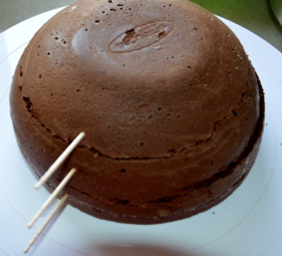 Una vez frío, cortamos en tres en tres capas (los palillos nos ayudan de referencia cuando vamos a unir de nuevo las tres partes, cada una va a estar justo en su punto exacto y la tarta no se deforma)