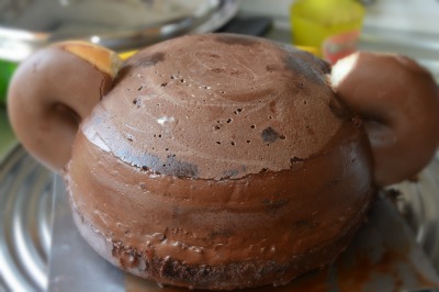En cada lateral de la tarta, cortamos un rectángulo, donde encajaremos los dos donuts ( cuidado para no hacer el corte demasiado grande)