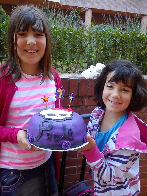 Siiii, ya sé que levo muuucho tiempo publicando recetas dulces, pero es que es lo que hay... y lo que queda jejeje. Prometo que la siguiente receta será salada, palabrita :D. Pero es que esta vez tengo una excusa muiy buena, y es que el pasado 31 de Mayo fue el cumple de mi pequeña, Paula!!! 7 añitos ya, quien lo diría verdad??? Esta tarta se la hice para llevársela al cole y celebrarlo con sus compañer@s de clase. Que contenta iba ella con su tarta... Para muestra, un botón.