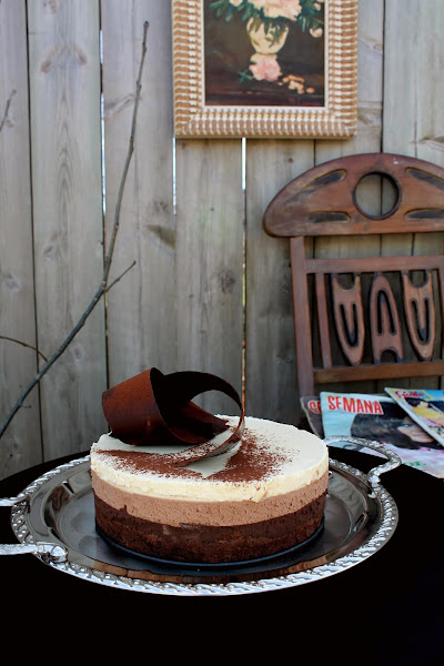 Ponemos el bizcocho de base. Sobre el vertemos la mousse de chocolate. Llevamos al congelador mientras seguimos con las otras capas. De esta forma al estar medio congeladas no se nos mezclaran los diferentes chocolates y quedara más bonita.